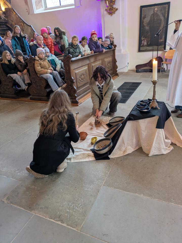 Zunächst legte Erstere dar, wie die verbrannten Palmzweige vom letzten Osterfest sinnbildlich dafür stünden, dass etwas zerbrochen sei, beispielsweise in einem selbst oder – vielleicht absichtsvoll – bei jemand anderem. Mit der nun anbrechenden Fastenzeit gebe es aber die Chance auf einen Neuanfang, eine Zeit ohne Schuldzuweisung z.B. – und dafür stehe das Aschekreuz als Symbol. Die Schulseelsorgerin machte ihre Message noch deutlicher: Mit gezielten Hammerschlägen durften einige Schülerinnen Tongefäße zerstören. Jeder Hammerschlag stand dabei für eine andere Art von Verletzung oder Schaden, etwa die passive Unterstützung bei Mobbing. Danach fragte sie: „Kann man daraus noch etwas machen?", und gab selbst die Antwort: „Es ist vielleicht nicht mehr so wie zuvor, aber ja!"