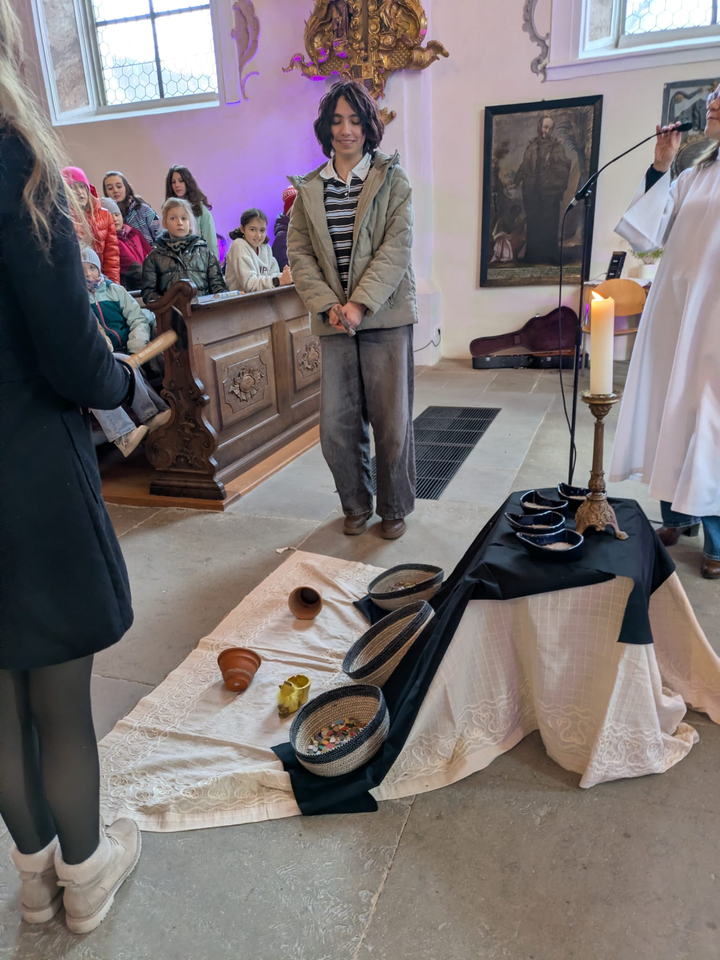 Abschließend erhielt die Schüler- und Lehrerschaft das Aschekreuz. Dabei spielte Hausmeister Alexander Schlegel mehrere Lieder auf der Orgel, die einen stimmungsvollen Rahmen bildeten, auch weil die Gemeinschaft dabei kleine, bunten Scherben, welche zuvor verteilt worden waren, symbolisch für ein bewussteres Verhalten „mitbrachte". Mit einem abschließenden Gebet, dem Vaterunser und der Erteilung des Gottessegen endete der Gottesdienst und leitete zum Unterrichtsalltag über.