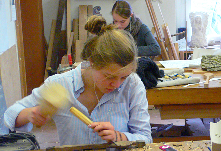 In der Ausbildung zur Holzbildhauerin lernen die Schülerinnen den fundierten handwerklichen und gestalterischen Umgang mit dem Werkstoff Holz und die für den Entwurfsprozess wichtigen Techniken z.B. Zeichnen, Modellieren und Abformen.