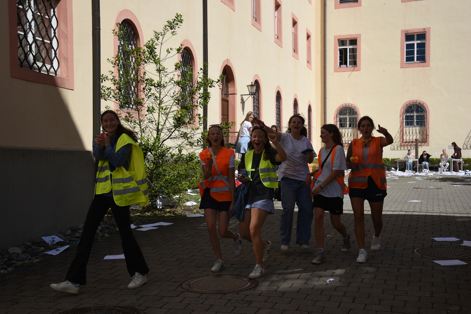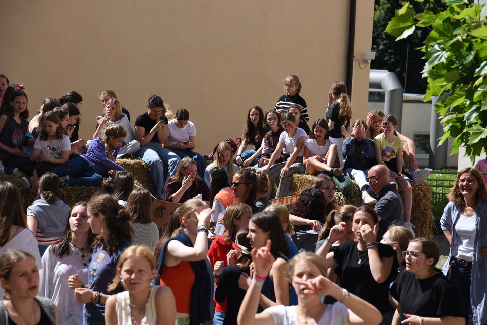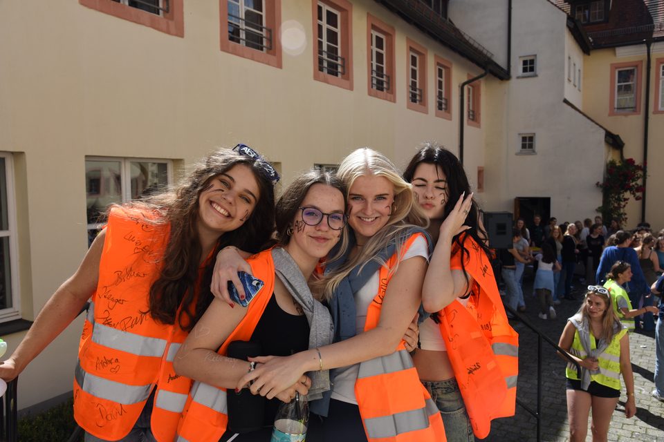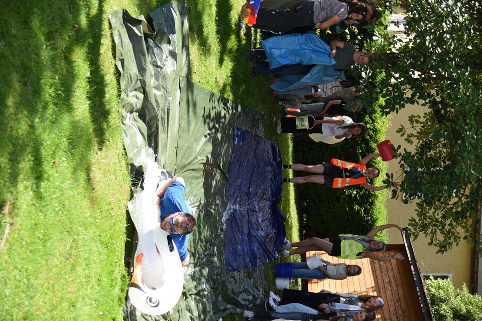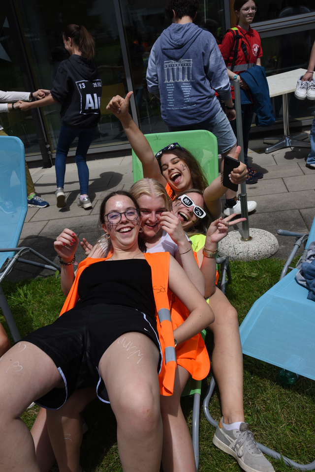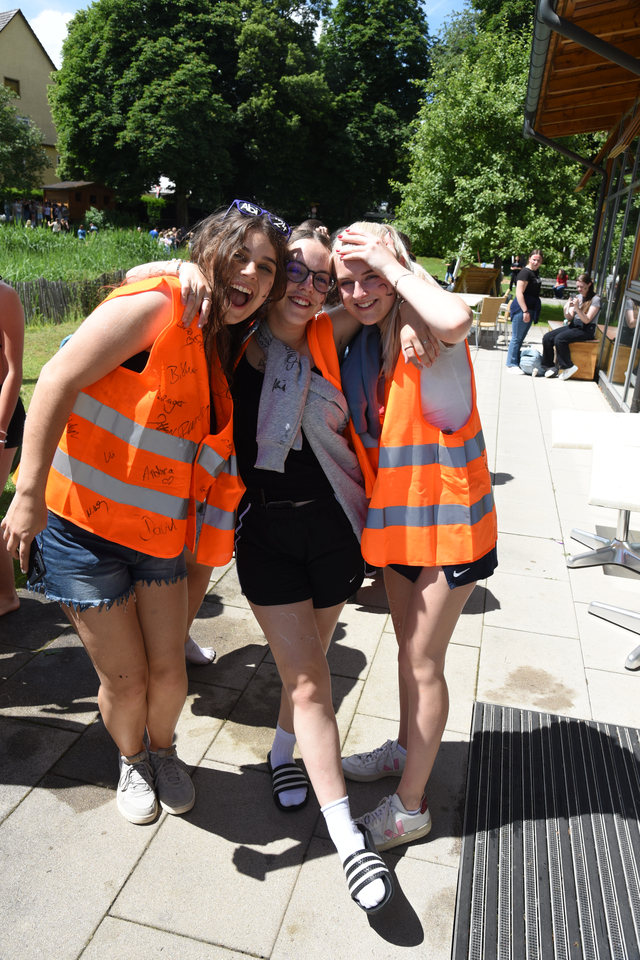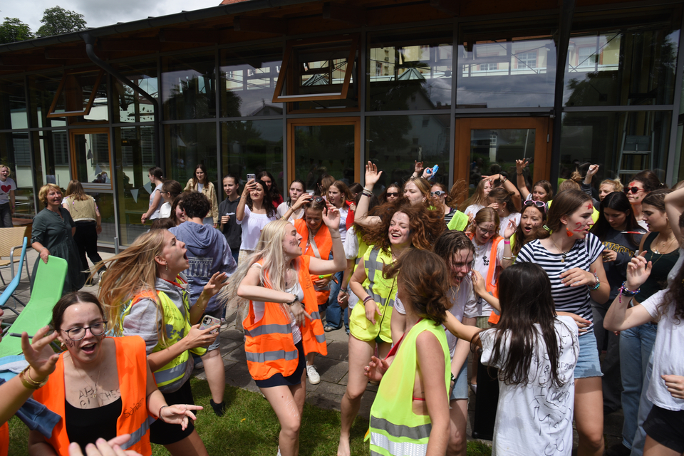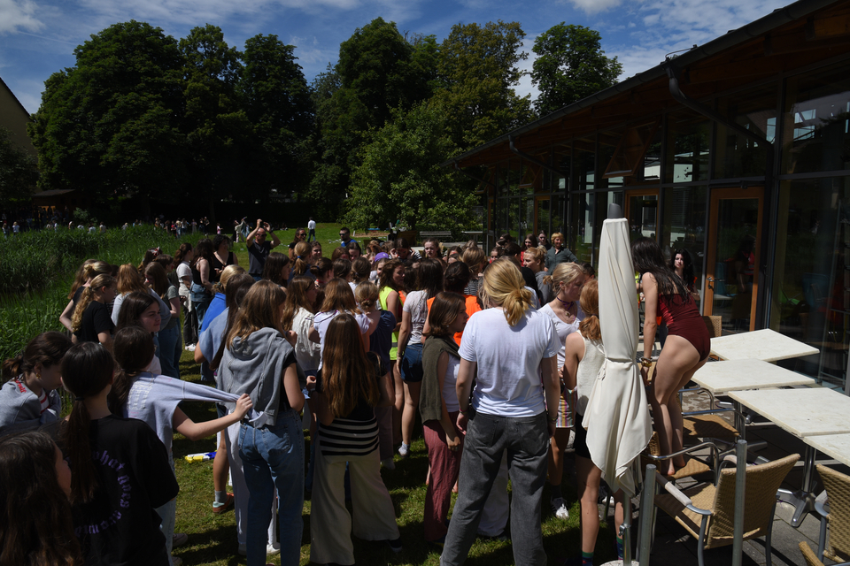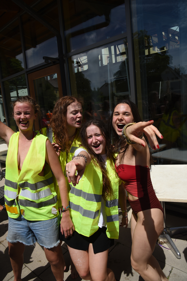 Die ersten beiden Stunden konnte man „fast" normal unterrichten (wenn einen die vollgeschriebenen Tafeln, Tischtürme etc. nicht gestört haben), in der dritten Stunde befreiten die 12er dann die Schülerinnen der anderen Stufen und scheuchten sie in den Innenhof. Hier war traditionsgemäß ein Gummiwagen als Tanzfläche aufgestellt, es lief laute Musik und die Schülerinnen hatten sogar ein „Gefängnis" aus Strohballen angeschleppt. In verschiedenen Spielen mussten sich Lehrer*innen beweisen, gegen Schülerinnen antreten oder andere Kolleg*innen aus dem Gefängnis befreien. Der Höhepunkt war neben dem ebenfalls traditionellen Sprung in den Weiher eine Wasserrutsche für alle Schülerinnen. Bei ausgelassener Stimmung feierten und tanzten die Oberstufenschülerinnen hinter der Mensa und genossen den Morgen.