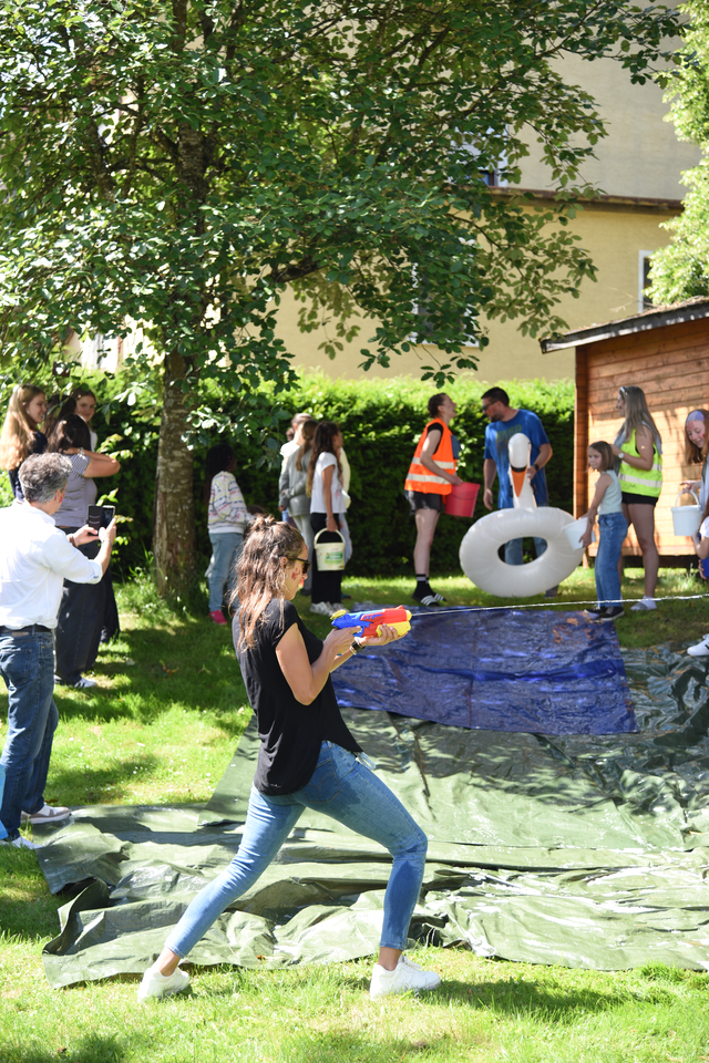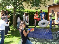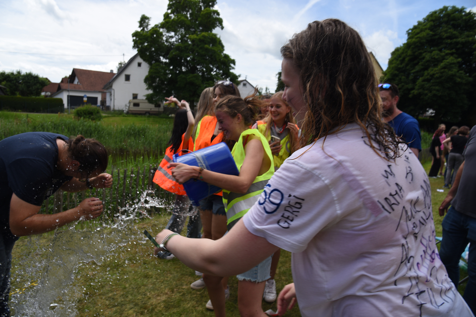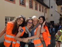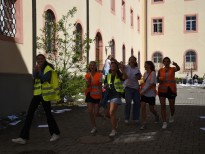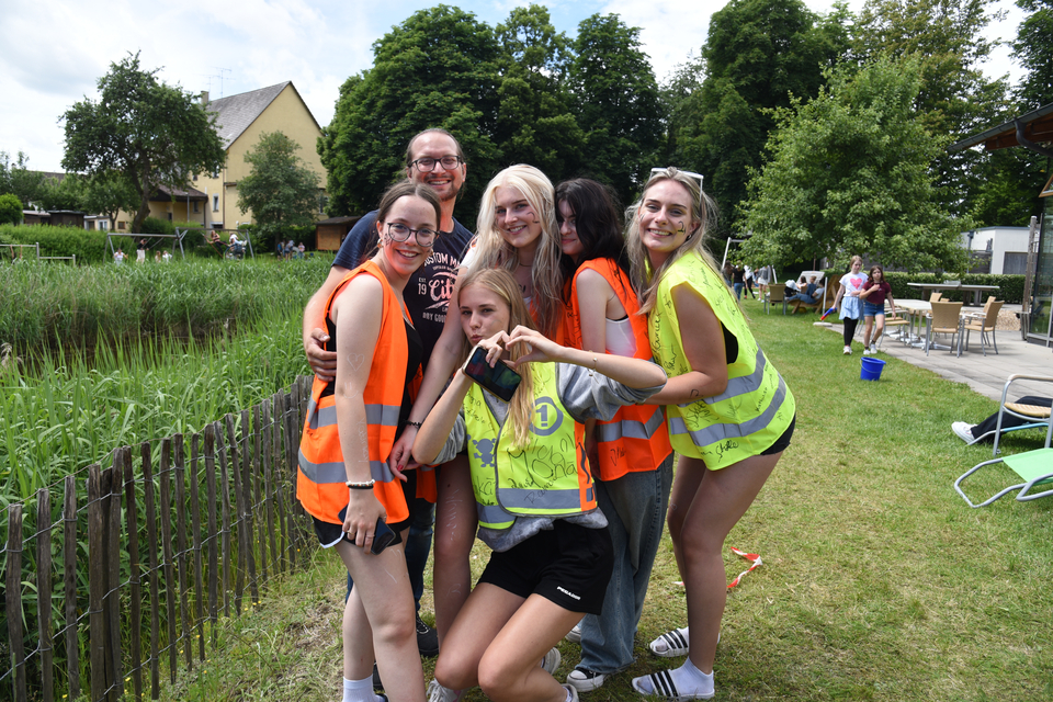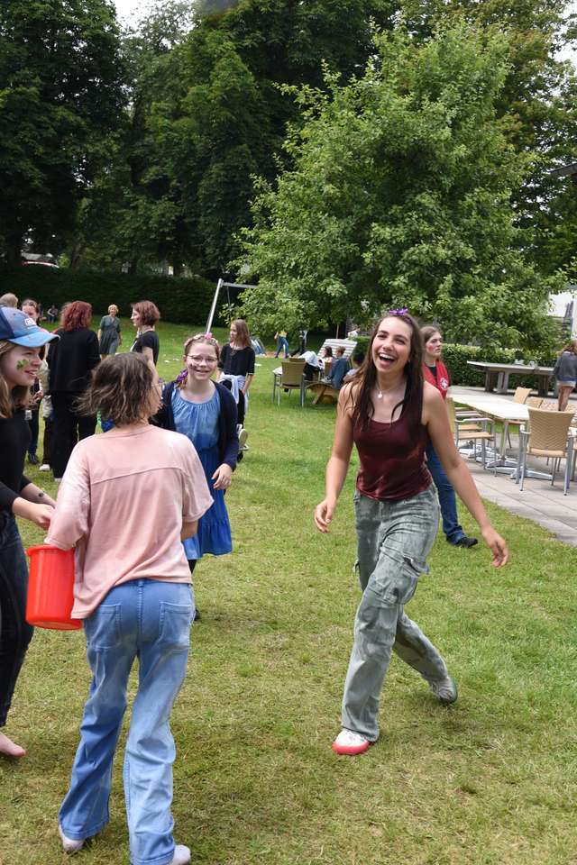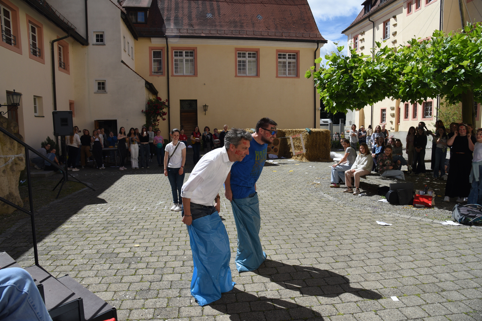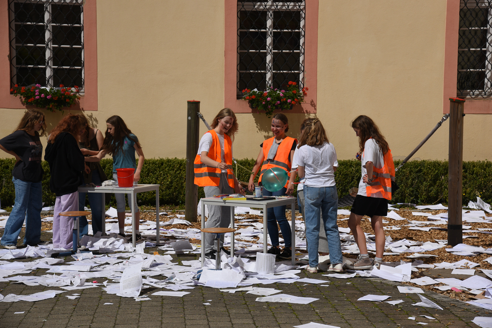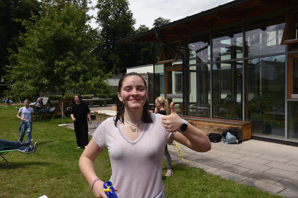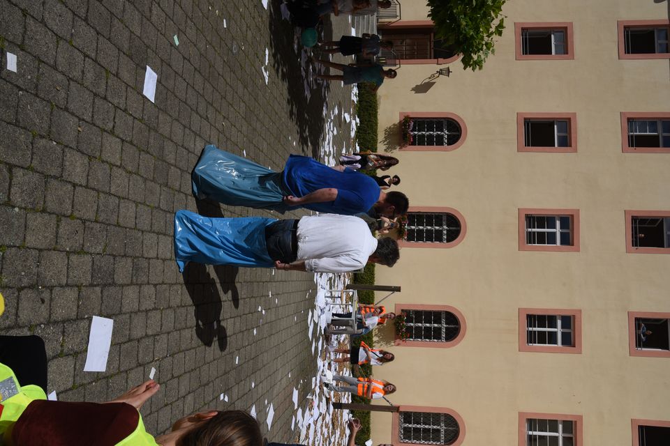Die ersten beiden Stunden konnte man „fast" normal unterrichten (wenn einen die vollgeschriebenen Tafeln, Tischtürme etc. nicht gestört haben), in der dritten Stunde befreiten die 12er dann die Schülerinnen der anderen Stufen und scheuchten sie in den Innenhof. Hier war traditionsgemäß ein Gummiwagen als Tanzfläche aufgestellt, es lief laute Musik und die Schülerinnen hatten sogar ein „Gefängnis" aus Strohballen angeschleppt. In verschiedenen Spielen mussten sich Lehrer*innen beweisen, gegen Schülerinnen antreten oder andere Kolleg*innen aus dem Gefängnis befreien. Der Höhepunkt war neben dem ebenfalls traditionellen Sprung in den Weiher eine Wasserrutsche für alle Schülerinnen. Bei ausgelassener Stimmung feierten und tanzten die Oberstufenschülerinnen hinter der Mensa und genossen den Morgen.