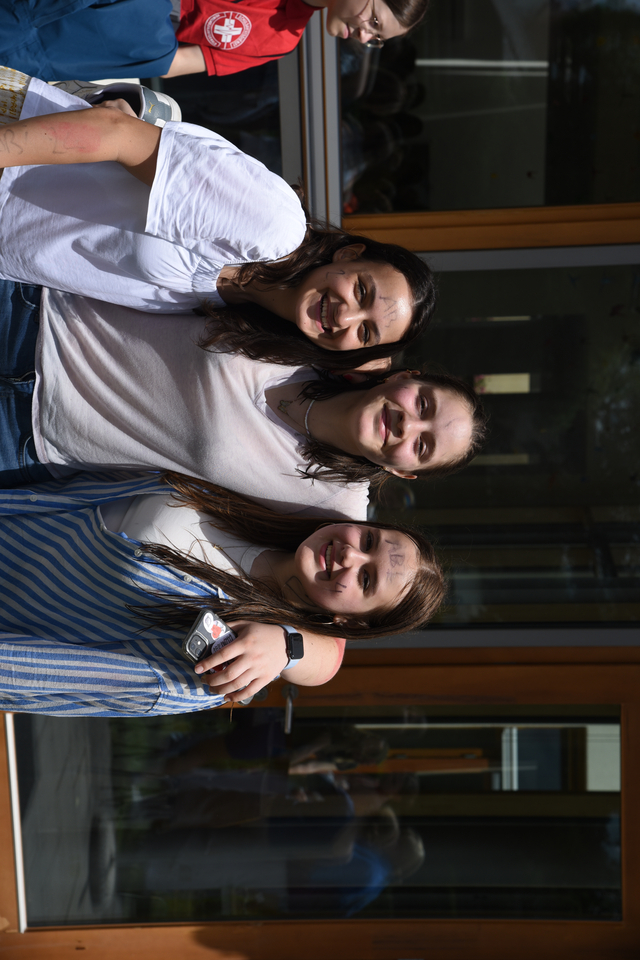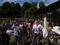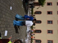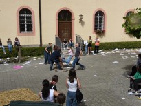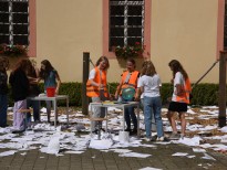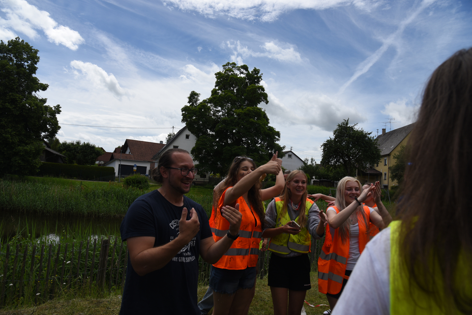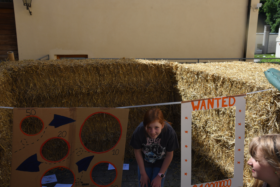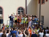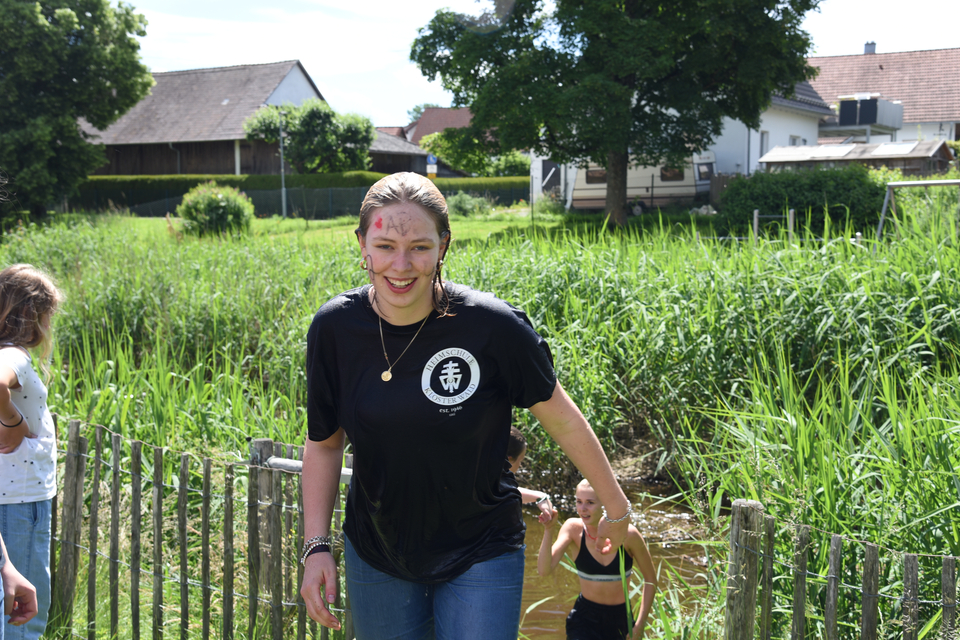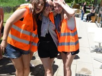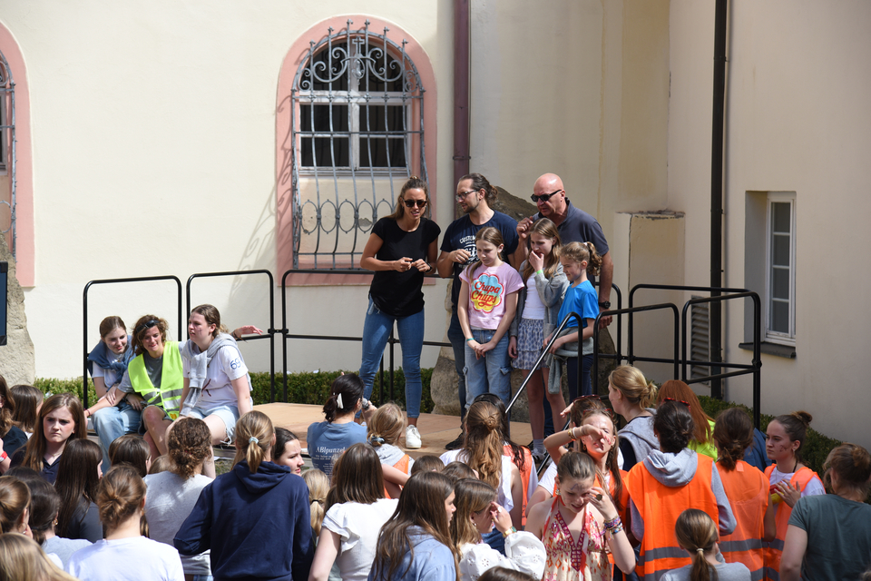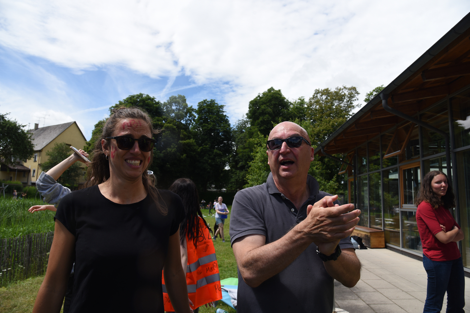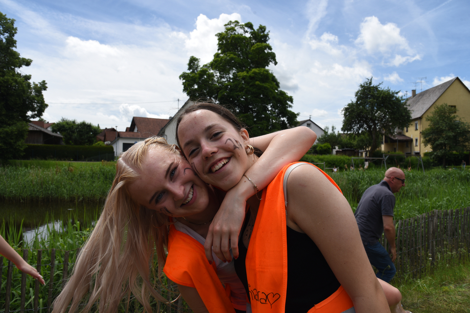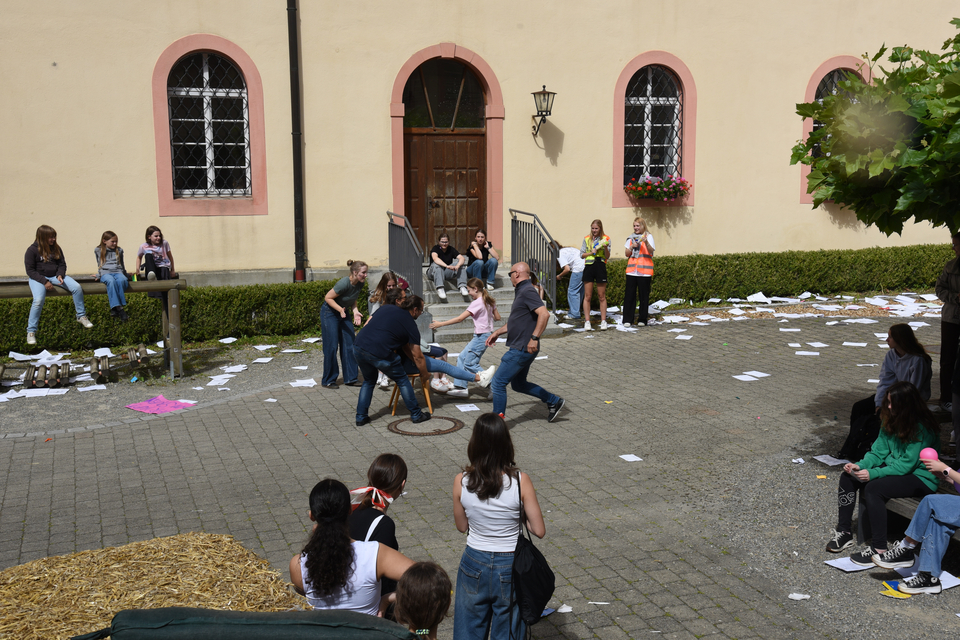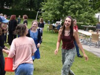 Die ersten beiden Stunden konnte man „fast" normal unterrichten (wenn einen die vollgeschriebenen Tafeln, Tischtürme etc. nicht gestört haben), in der dritten Stunde befreiten die 12er dann die Schülerinnen der anderen Stufen und scheuchten sie in den Innenhof. Hier war traditionsgemäß ein Gummiwagen als Tanzfläche aufgestellt, es lief laute Musik und die Schülerinnen hatten sogar ein „Gefängnis" aus Strohballen angeschleppt. In verschiedenen Spielen mussten sich Lehrer*innen beweisen, gegen Schülerinnen antreten oder andere Kolleg*innen aus dem Gefängnis befreien. Der Höhepunkt war neben dem ebenfalls traditionellen Sprung in den Weiher eine Wasserrutsche für alle Schülerinnen. Bei ausgelassener Stimmung feierten und tanzten die Oberstufenschülerinnen hinter der Mensa und genossen den Morgen.