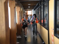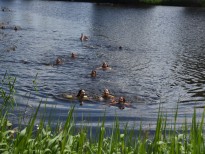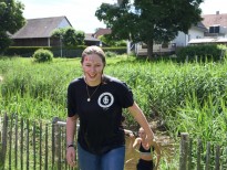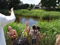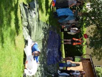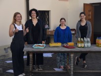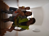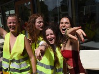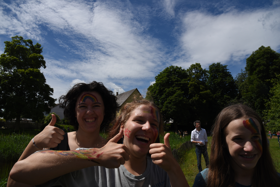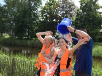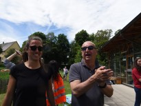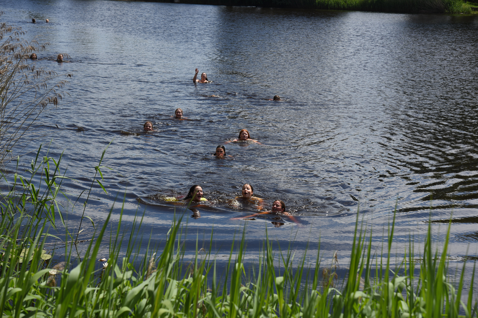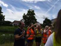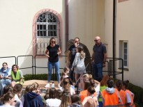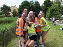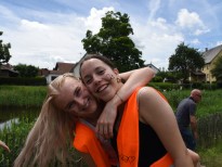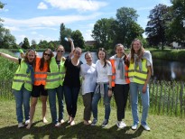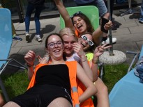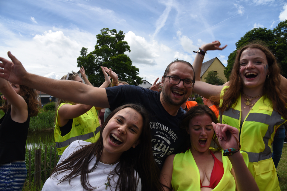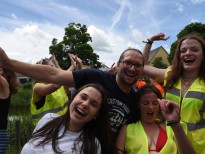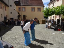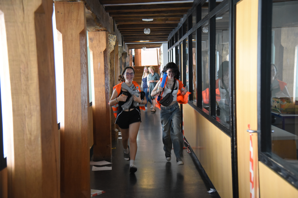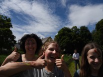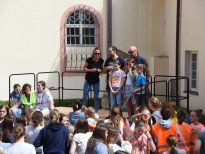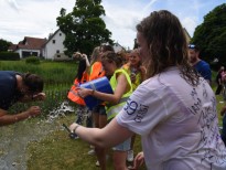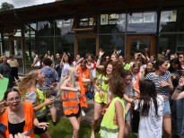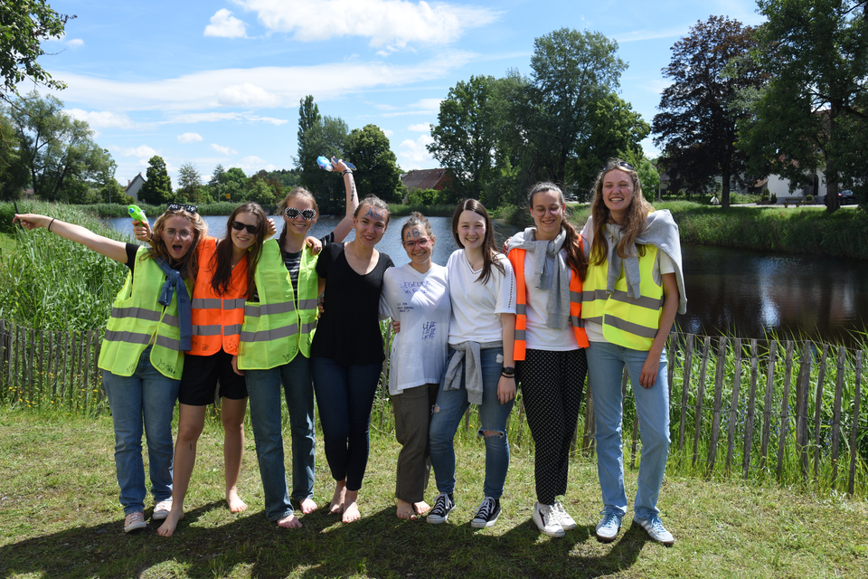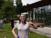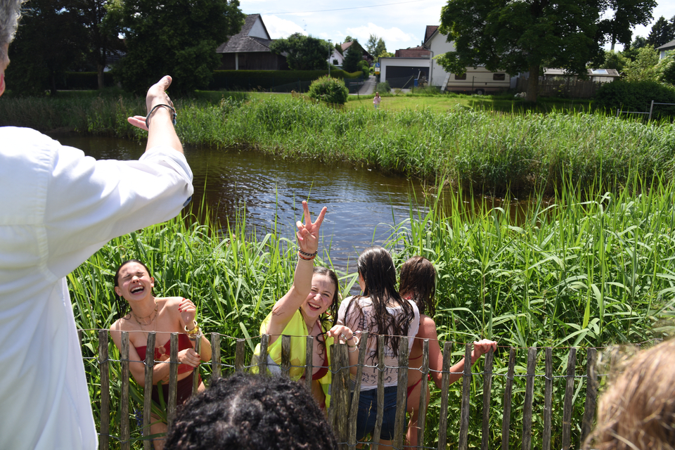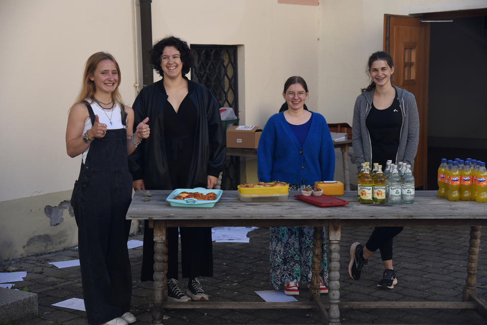 Die ersten beiden Stunden konnte man „fast" normal unterrichten (wenn einen die vollgeschriebenen Tafeln, Tischtürme etc. nicht gestört haben), in der dritten Stunde befreiten die 12er dann die Schülerinnen der anderen Stufen und scheuchten sie in den Innenhof. Hier war traditionsgemäß ein Gummiwagen als Tanzfläche aufgestellt, es lief laute Musik und die Schülerinnen hatten sogar ein „Gefängnis" aus Strohballen angeschleppt. In verschiedenen Spielen mussten sich Lehrer*innen beweisen, gegen Schülerinnen antreten oder andere Kolleg*innen aus dem Gefängnis befreien. Der Höhepunkt war neben dem ebenfalls traditionellen Sprung in den Weiher eine Wasserrutsche für alle Schülerinnen. Bei ausgelassener Stimmung feierten und tanzten die Oberstufenschülerinnen hinter der Mensa und genossen den Morgen.