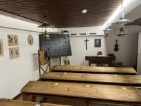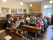 Am Mittwochmorgen feierten die Klassen noch in Wald einen kurzen Gottesdienst, ehe sie sich dann mit Sack und Pack unter Begleitung der Lehrkräfte Magdalena Vallendar und André Kiefer ins Schulmuseum nach Friedrichshafen aufmachten. Dort wurden alle auf zwei Gruppen aufgeteilt und fachmännisch durchs Haus geführt. Mehrere Klassenzimmer „der alten Schule" wurden erforscht, das heißt enge Sitzbänke erkundet, Einlassungen für kleine Tintenfässer ertastet, das Lesen der Sütterlin-Schrift erprobt und viel mehr. Den Höhepunkt der Veranstaltung für die Kinder stellte das Nachspielen einer „originalen" Unterrichtssituation dar: Wehe, die Hände lagen nicht ausgestreckt auf der Holzbank...