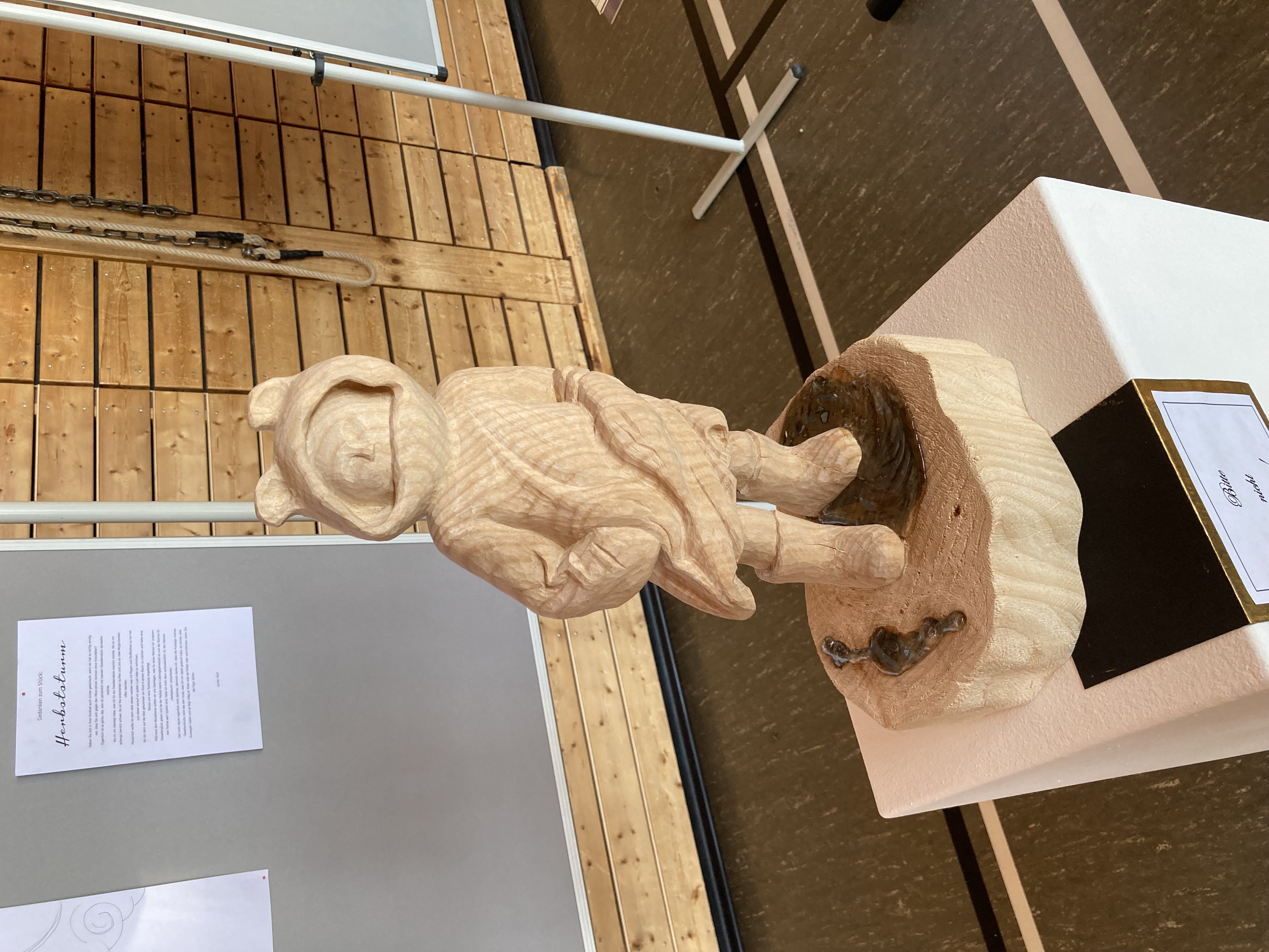 Beeindruckende Gesellenstücke waren es, die sich Mitarbeitende der Heimschule Kloster Wald und Freunde sowie Angehörige der Gesellinnen bereits am Vormittag bei einem Rundgang in der Turnhalle zu Gemüte führen konnten: Ein höhenverstellbarer Schreibtisch und eine mit verschiedenfarbigen LEDs ausgekleidete Arbeitsfläche waren nebst eigens konzipierten und geformten Holzkunstwerken wie zum Beispiel einer männlichen, nach oben blickenden Figur mit leerer Augenhöhle – Titel „Burnout" – darunter. Jedes Jahr ist und bleibt es gerade für Außenstehende eindrucksvoll, zu welchem handwerklichen Vermögen die Schülerinnen in vergleichsweise kurzer Zeit gelangen und wie sie ihren privaten Ideen und Themen Ausdruck zu verleihen vermögen.