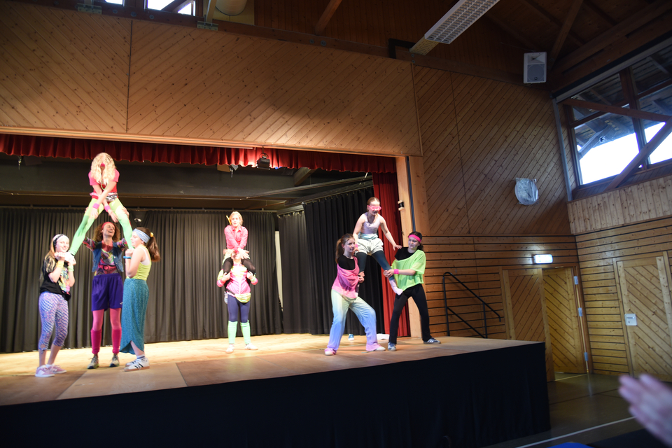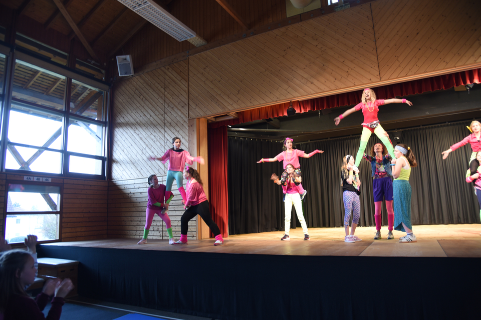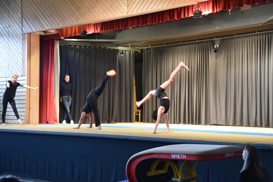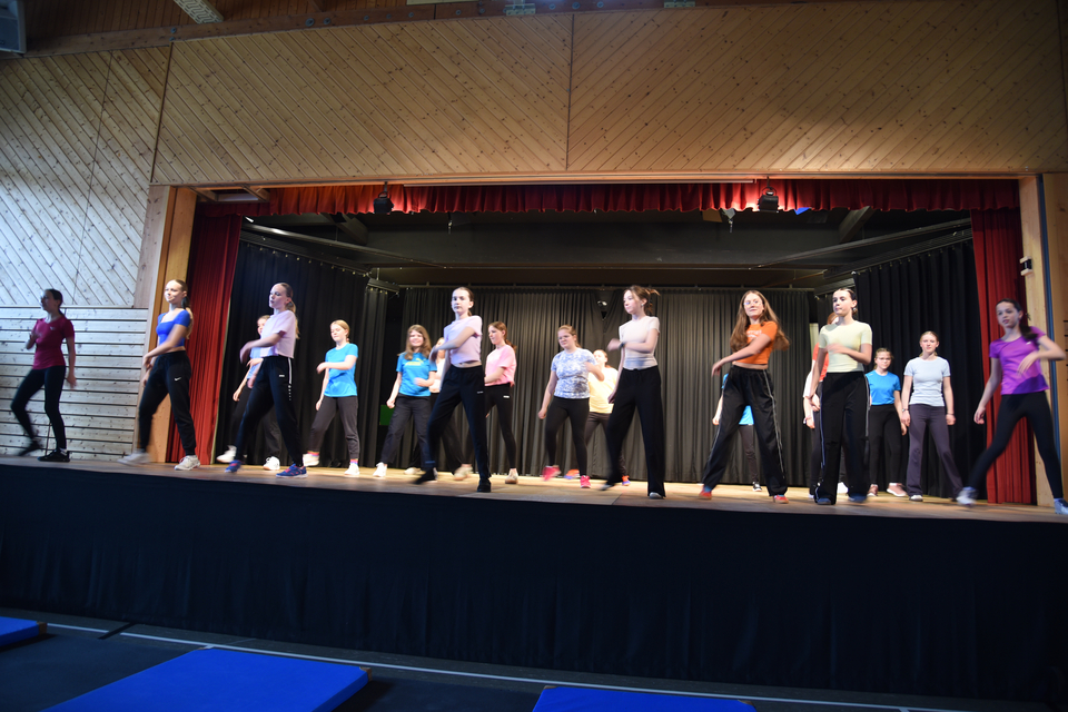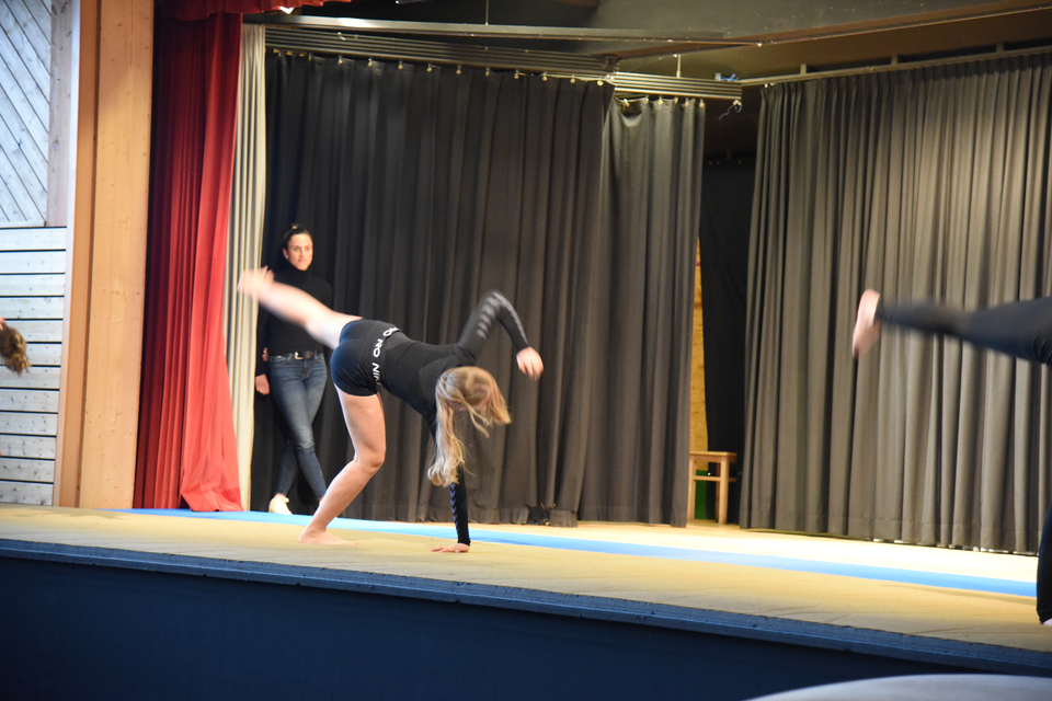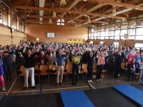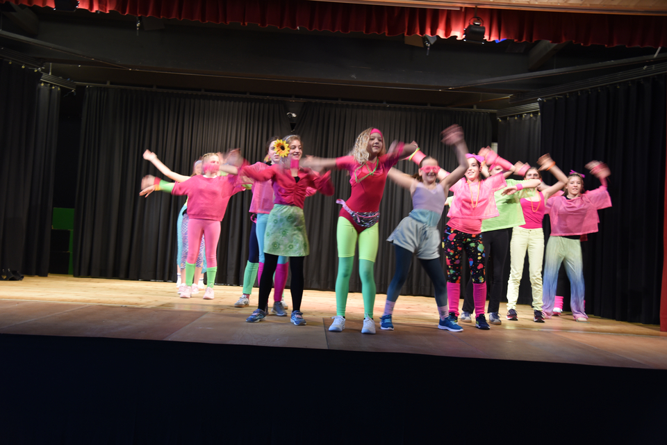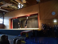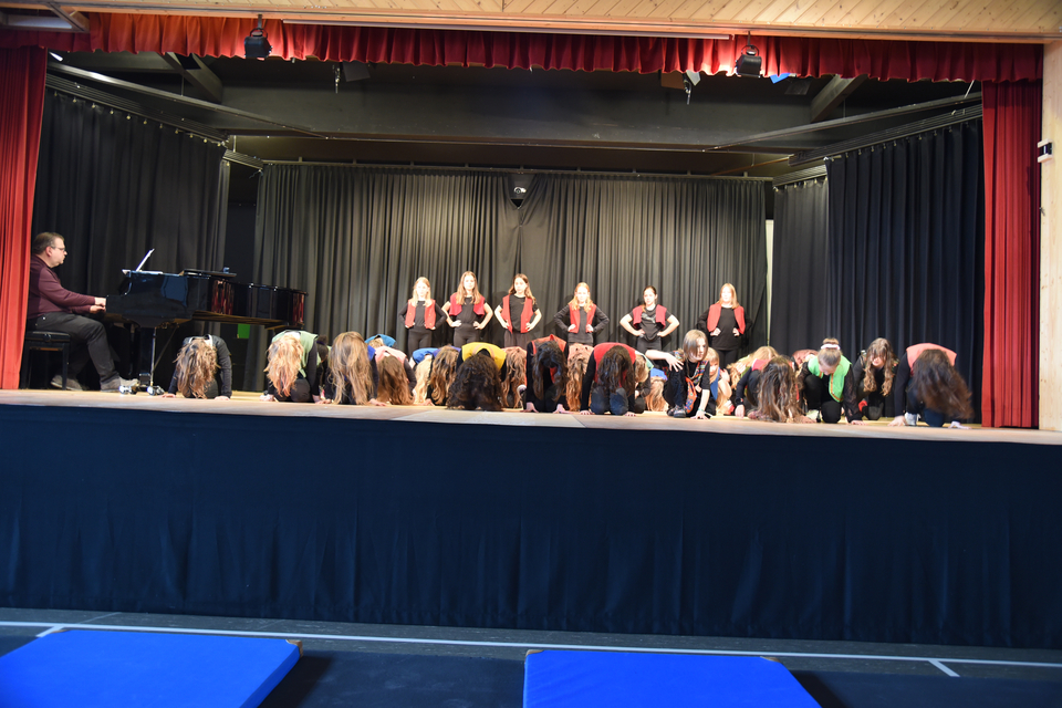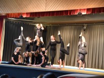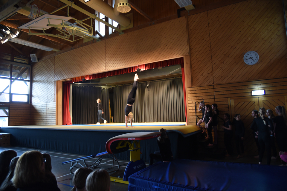 Das Highlight des Tages waren sicherlich die musikalischen und sportlichen Darbietungen in der Sporthalle. Hier zeigten die Schülerinnen ihren Eltern, was sie alles (neben dem Lernen) an der Schule so machen. Hier war alles dabei - angefangen von den Streicherklassen und dem Orchester, beides unter der Leitung von Gudrun Hafner, über stimmvolle Gesangsdarbietungen des Chors und der Waldlerchen unter der Leitung von Isabell Marquardt bis hin zu mitreißenden und abwechslungsreichen Tänzen und Vorführungen einzelner Klassen und der klassenübergreifenden Turnschau. Die Musikstücke waren abwechslungsreich und bestens auf die Zusammensetzung der jeweiligen Gruppe abgestimmt. Die Tänze der Klassen deckten auch verschiedene Bereiche ab - Jumpstyle, Linedance und anspruchsvolle Choreografien. Sogar das Publikum wurde von der quietschbunten Truppe dazu animiert mitzumachen, das gab es so noch nie. Die Turnerinnen zeigten Handstand, Rad, Bogengang und vieles mehr und flogen in hohem Bogen davon - zumindest wirkte es so, als sie am Ende waghalsige Sprünge auf dem Trampolin wagten. Vielen Dank an die Sportlehrerinnen Jasmin Schick, Jennifer Frirdich, Claudia Madlener und Ines Schramm für das Einstudieren dieser tollen Shows!