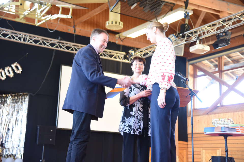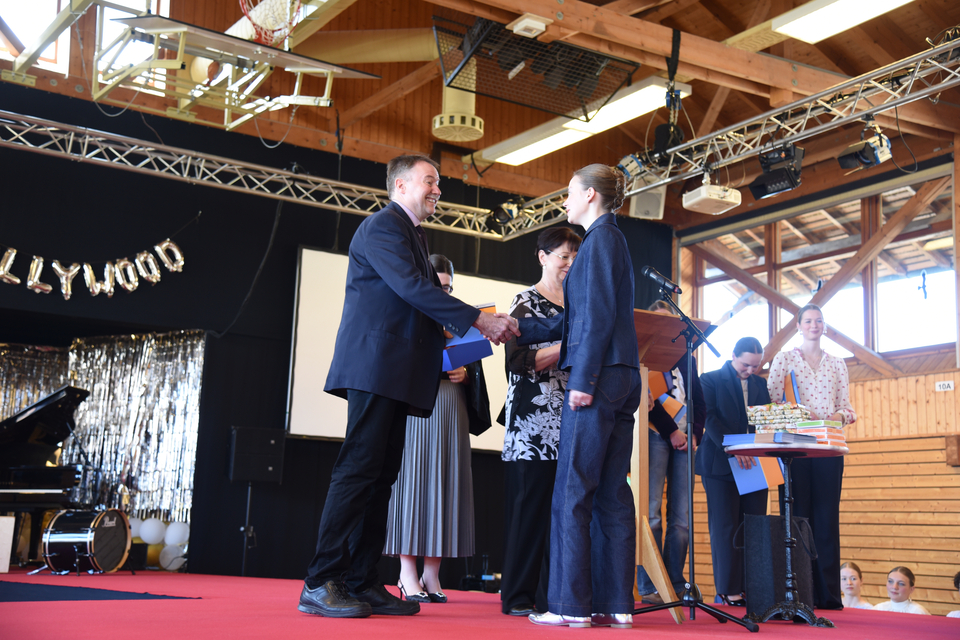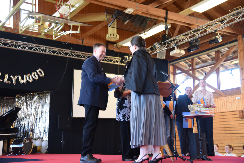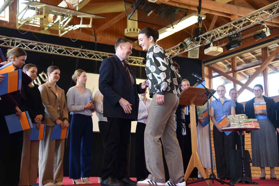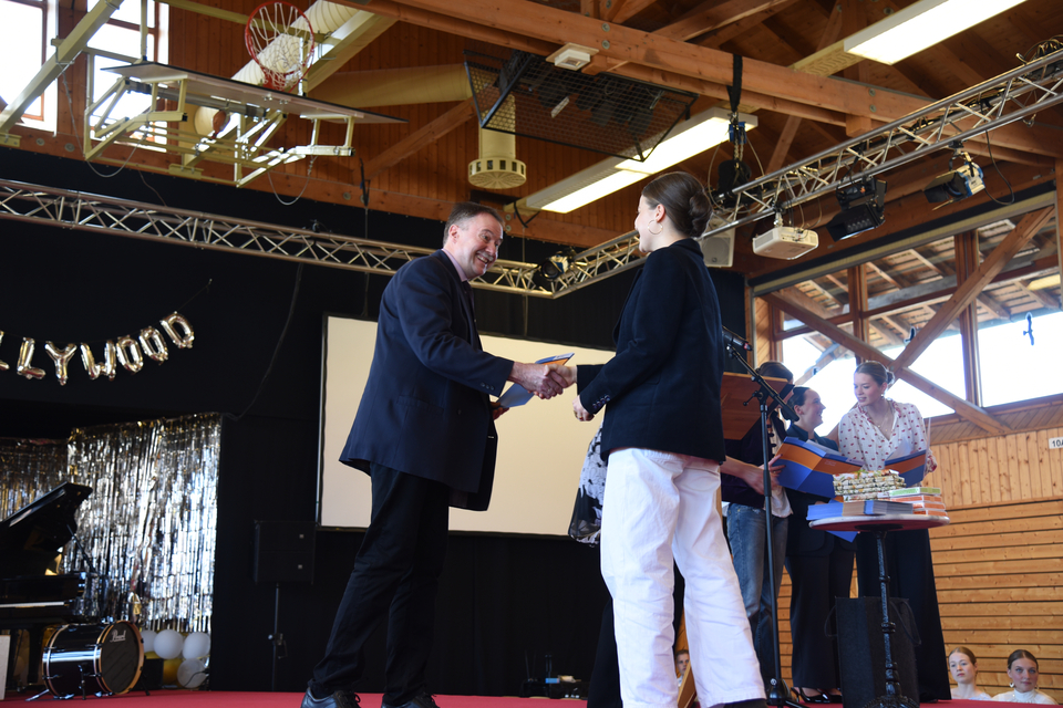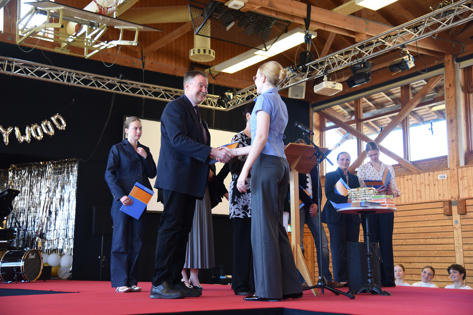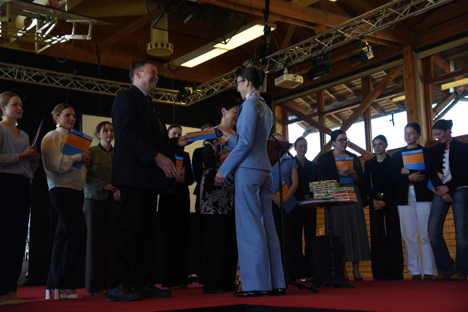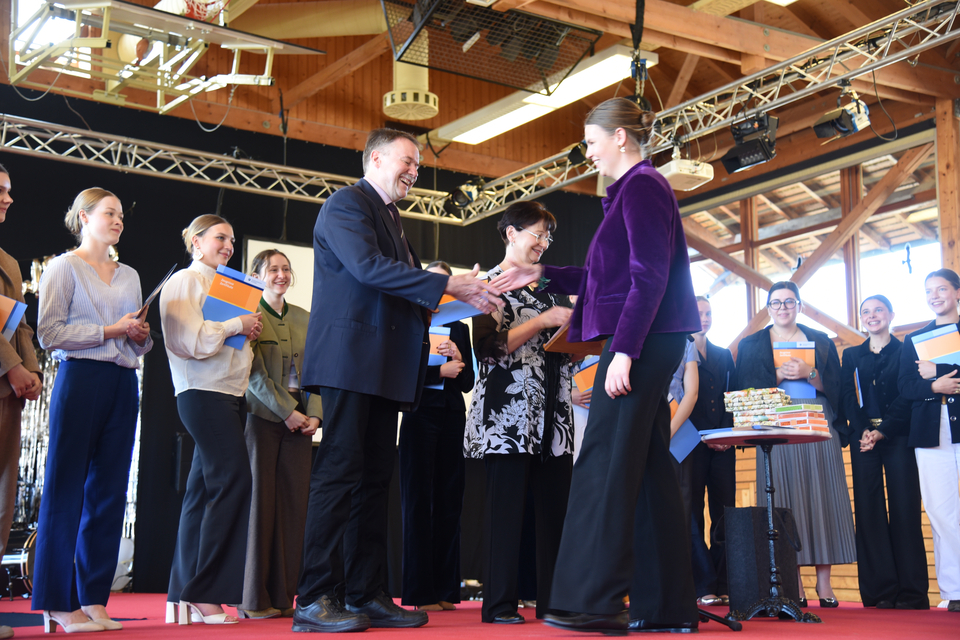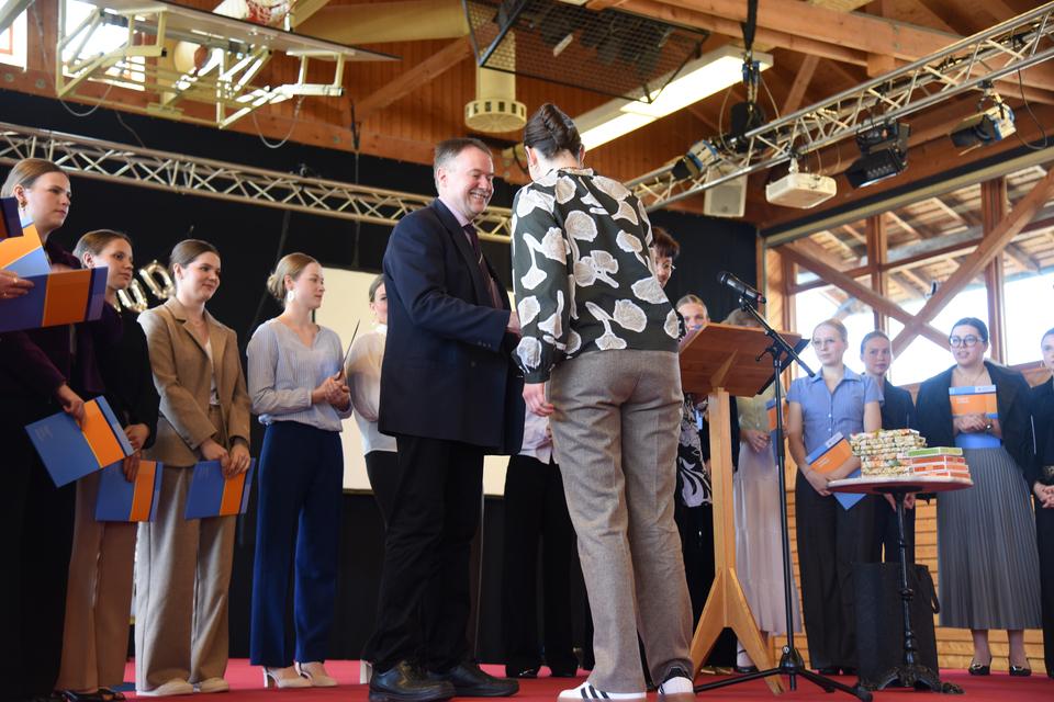 Schulleiterin Heidi Linster nannte es einen "strahlenden Tag", bei dem die jungen Gesellinnen und die Sonne um die Wette strahlten. Sie beglückwünschte die jungen Damen für ihr handwerkliches Können, ihre Kreativität - und darum, dass sie etwas können, was eine KI nicht kann: Mit den Händen etwas Schönes und Praktisches herstellen. Sie nahm Bezug auf den "Anfängergeist", den die Mädchen zu Beginn ihrer Ausbildung in Klasse 9 in Anbetracht der ersten Stiche, Schnitte und selbstgemachten Kleidungsstücken erfahren haben. Diesen sollen sie auch in Zukunft bewahren, denn auch im weiteren Leben wird es oft Situationen geben, in denen sie sich wie Anfänger fühlen werden. Aber mit ihrem Wissen, Können und der Kreativität werden sie auch mitdiesen neuen Situationen klarkommen. Sie sandte die jungen Frauen aus mit dem Zitat: "Ihr hinterlasst Spuren - schöne Spuren, ihr macht die Welt ein bisschen schöner".