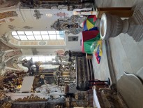 Gleich zu Anfang ihrer Predigt legte sie das überspannende Thema dar: Gott bzw. Gottes Hände als schützender Schirm für die Menschen. Für die neuen Viert- und Fünftklässlerinnen, aber auch sonstige Neuzugänge beginnt in Wald eine neue Zeit, die möglicherweise anfangs von Unsicherheit und Sorge gekennzeichnet ist. Aber es ist nichts zu befürchten: So wie Gott schützend seine Hände über uns hält, wird auch die Schule für ihre Neulinge Sorge tragen. Mithilfe mehrerer bunter Regenschirme und einem großen Tuch als eine Art „Regenschutzsegel" wurde die biblische Metapher dann parallel dazu schön veranschaulicht. Dabei erhielt Fr. Schramm von acht Schülerinnen ihres Kurses der Klasse 12 tatkräftige Unterstützung, auch später im Kontext der von allen in der Kirche verfassten Fürbitten, die dann eingesammelt und ausschnittsweise vorgelesen wurden.
