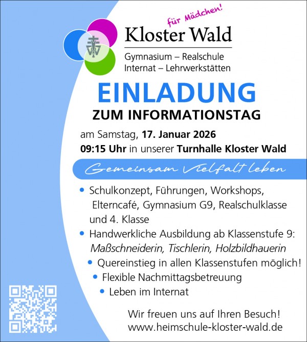 Am Samstag, 17. Januar 2026 lädt die Heimschule Kloster Wald herzlich alle interessierten Schülerinnen und Familien zum Informationstag ein.