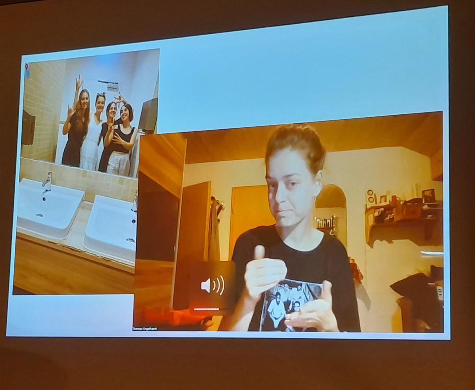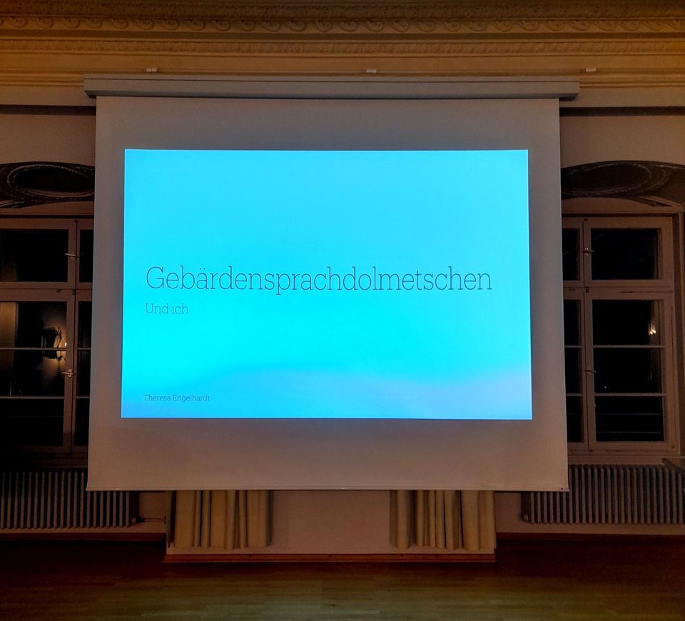 Theresa Engelhardt hat im Anschluss an Kloster Wald ein intensives Studium zur Gebärdendolmetscherin begonnen. Sie hat einige Videos mitgebracht, in denen sie in Aktion zu sehen war.