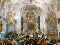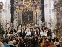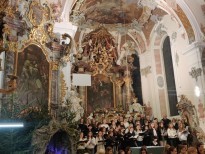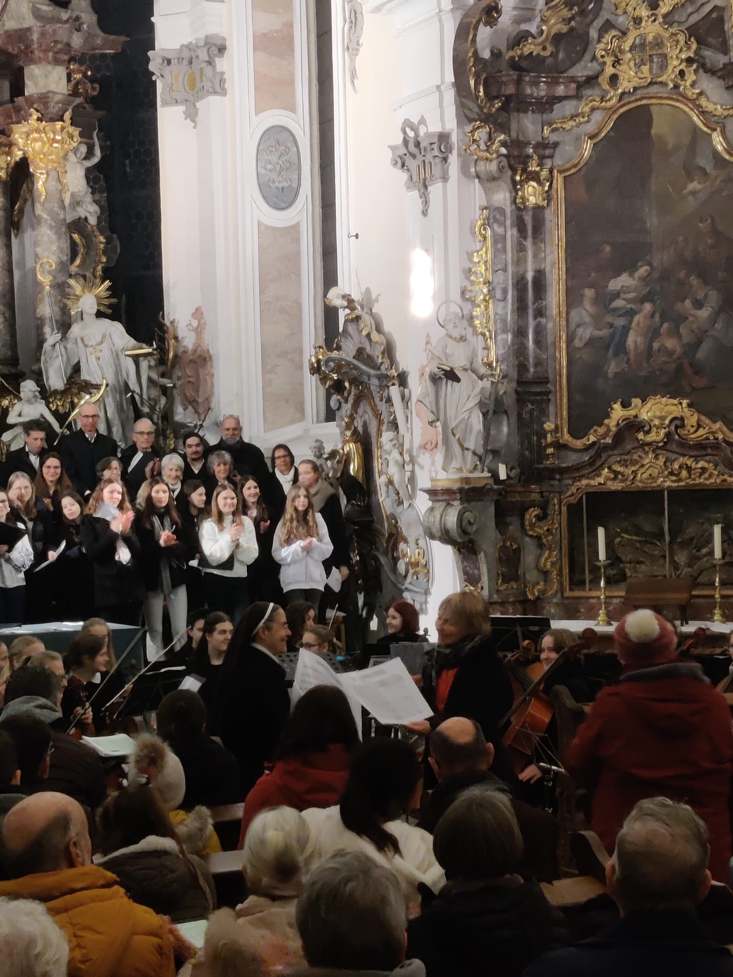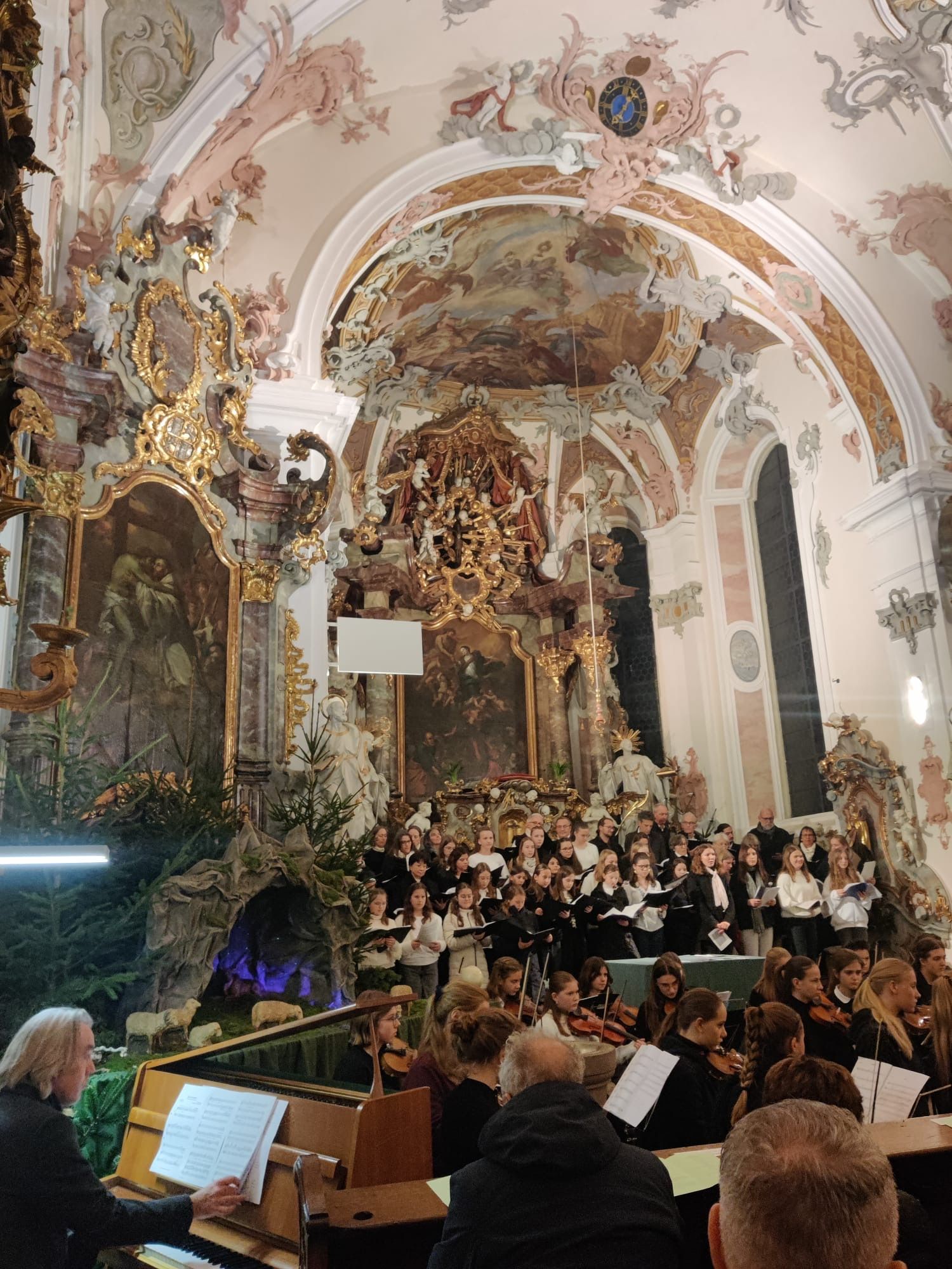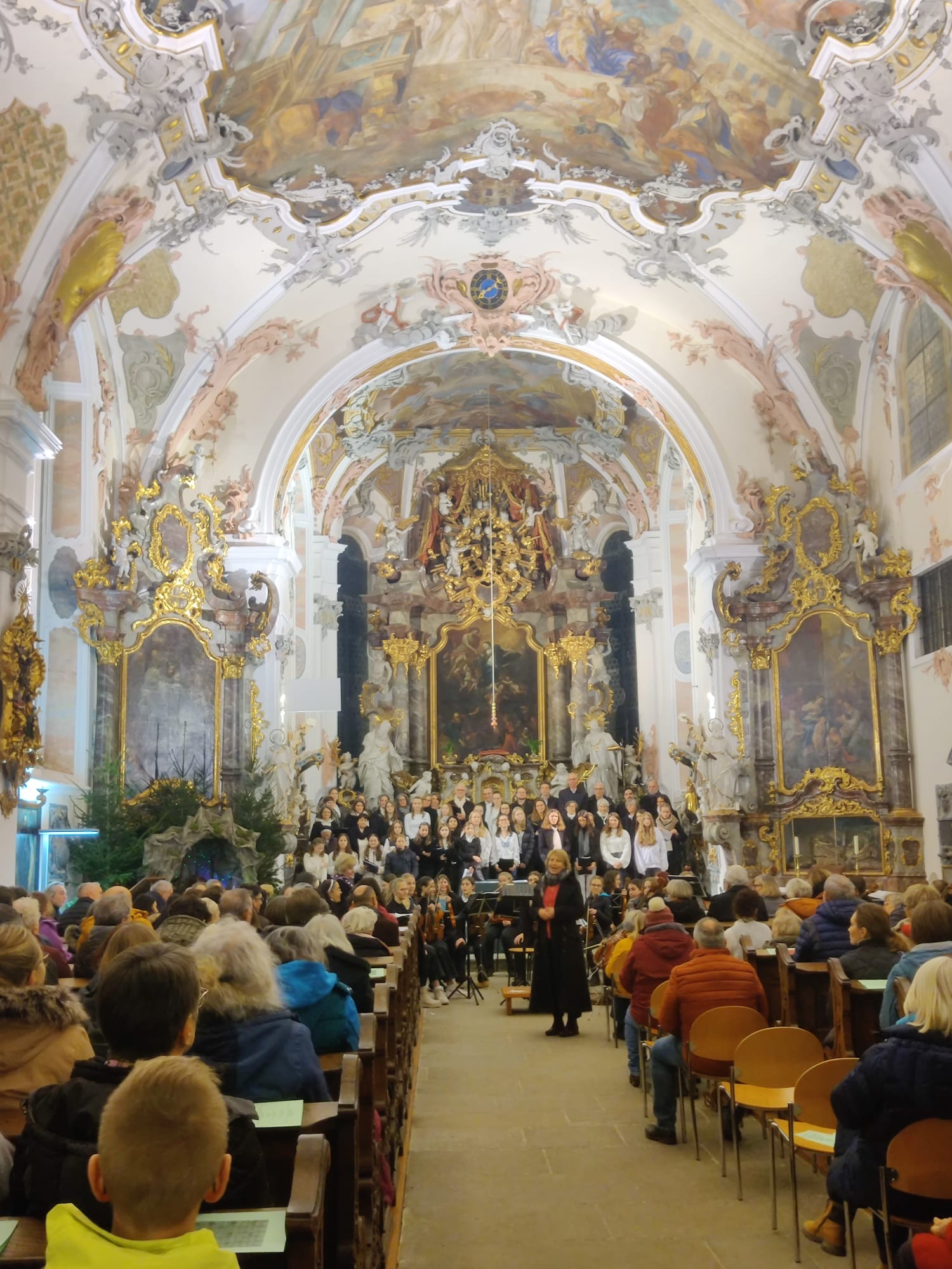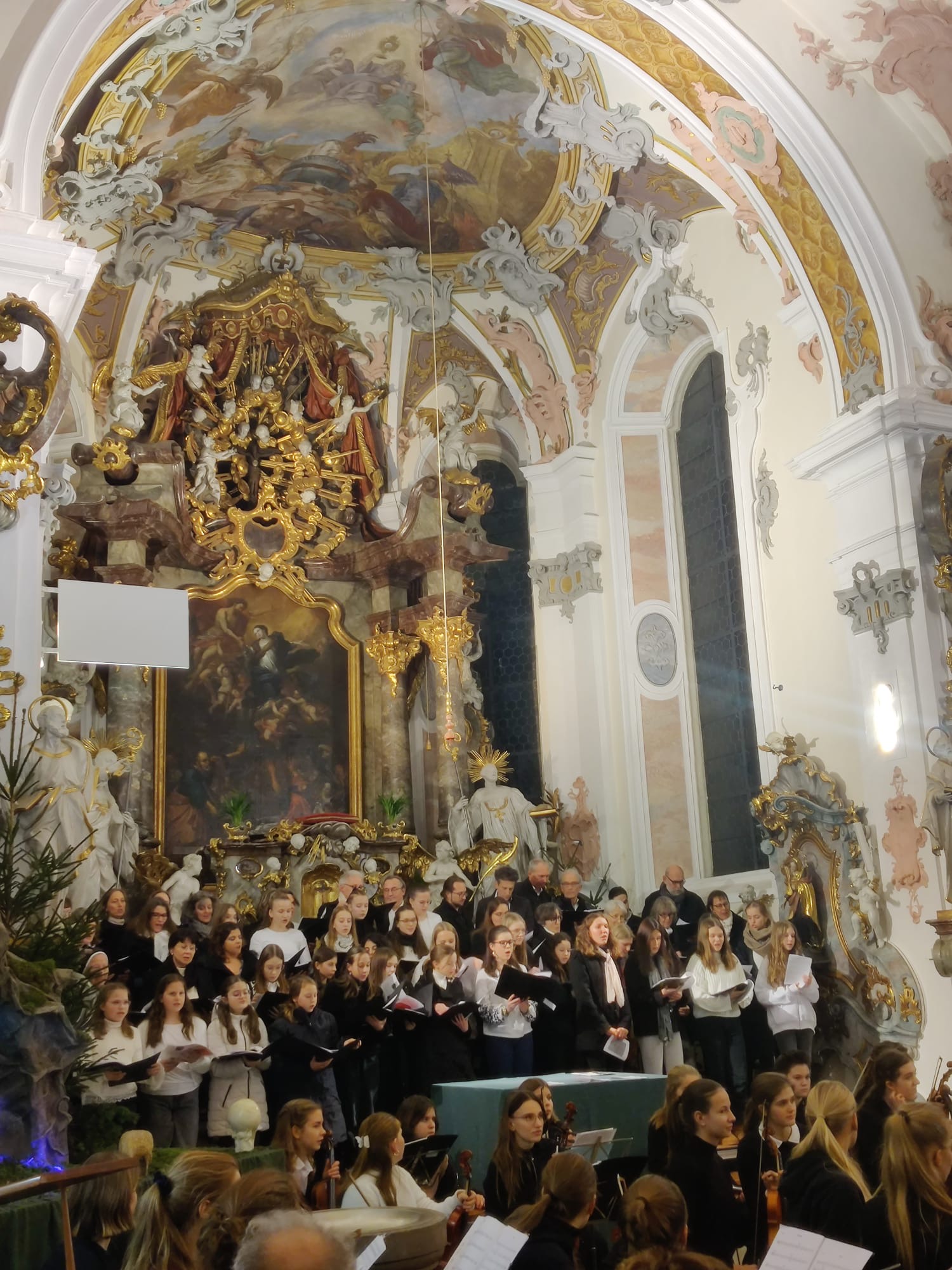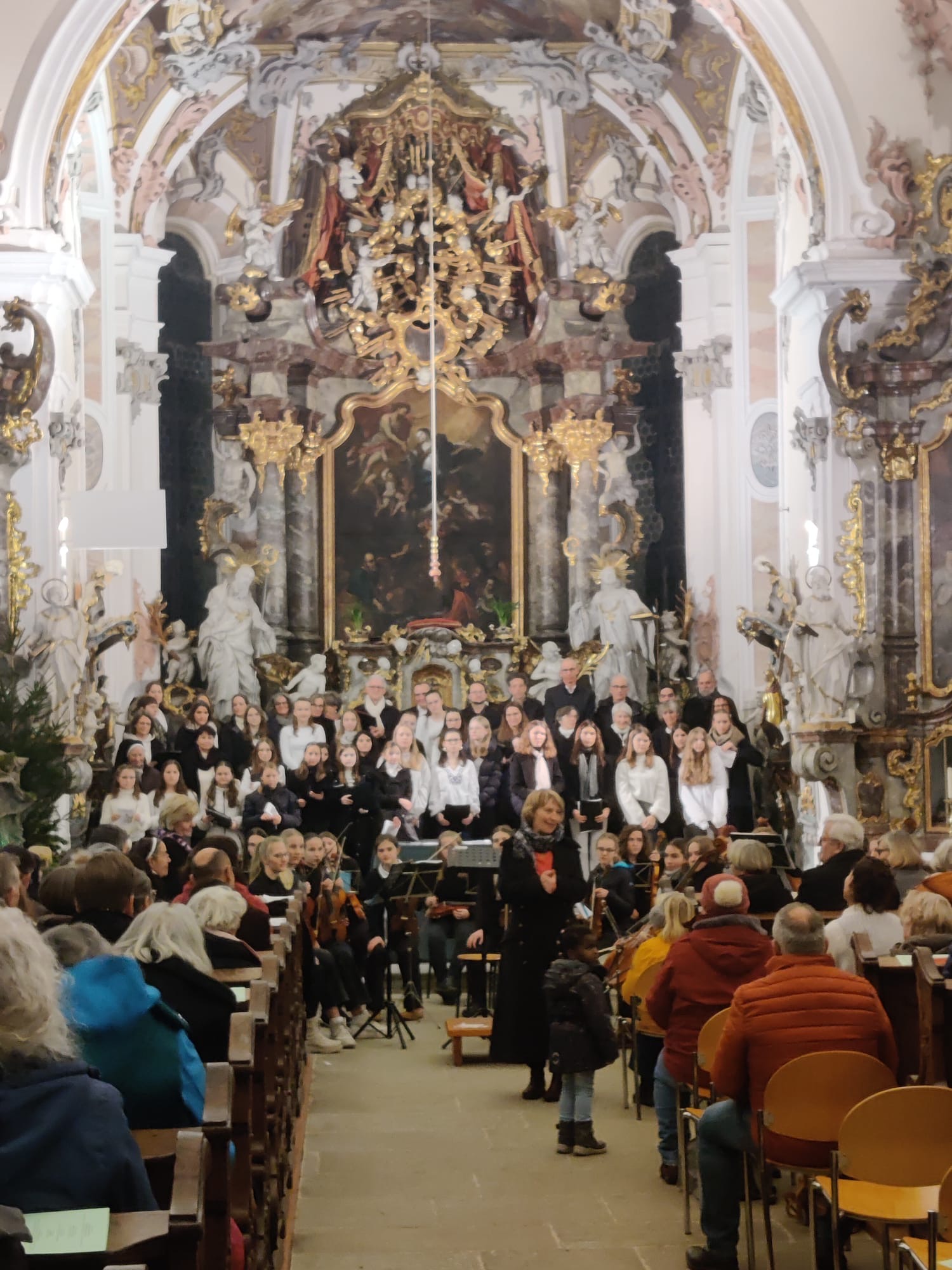 Um 18.30 Uhr war es schließlich so weit: Wolfgang Amadeus Mozarts „Romanze", gespielt vom schulischen Streich-Orchester unter Leitung von Gudrun Hafner, eröffnete das Weihnachtskonzert. Daran knüpften unter anderem klassische Stücke von Bréval, Schubert und Bach, aber auch moderne Kompositionen, beispielsweise des Briten John Rutter oder des US-Amerikaners Buddy Greene an. Dabei traten wiederholt Solistinnen hervor: Annika Hader (Cello), Magdalena Schmucker (Bratsche) und Annalena Harsch (Marimbaphon) wussten an ihren Instrumenten auf beeindruckende Art und Weise zu überzeugen. Mit „Angels Carol" kam dann erstmals auch der Mädchen-Chor der Schule unter tatkräftiger Unterstützung der Walder Mitarbeiter*innen und der Sänger*innen des Opernchores Überlingen unter der Leitung von Isabell Marquardt zum Einsatz. Uwe Münch begleitete das Stück wie auch nachfolgende am Klavier.