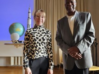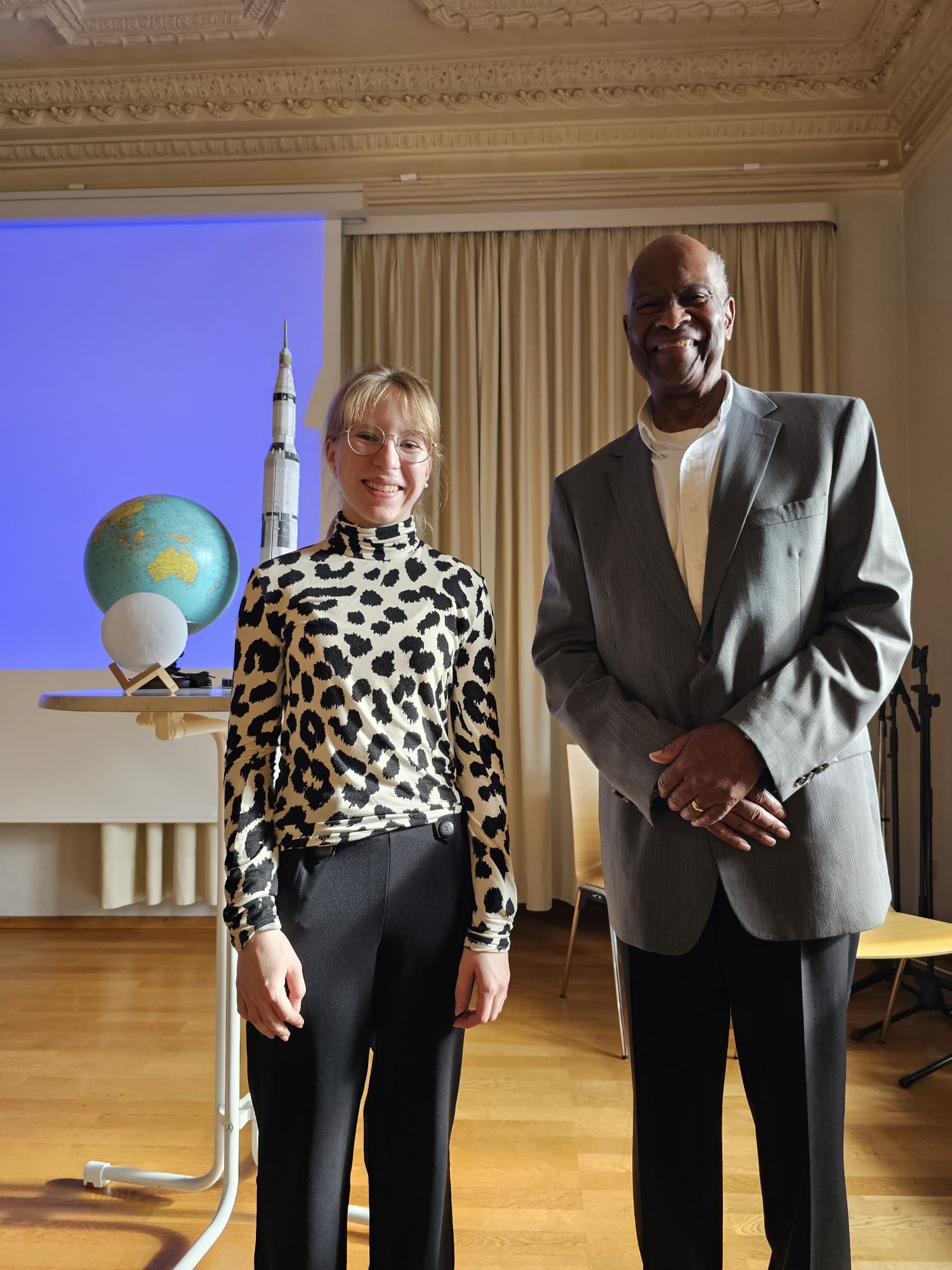 Danach übernahm der 80-jährige Ron Jones das Rednerpult und nach einer kurzen Einleitung auf Deutsch begann sein englischer Vortrag, dem alle neugierig lauschten. Dieser war gespickt mit allerlei historischen Referenzen – sei es zunächst Jones' Wahrnehmung des Sputnik-Schocks als 12-Jähriger oder etwa die berühmte Rede John F. Kennedys an der Rice University im Jahr 1962, als der US-Präsident mit den Worten „We must be bold" das seinerzeit ehrgeizige Ziel verkündete, bis zum Ende der 60er-Jahre einen Menschen auf dem Mond landen zu lassen (und damit das „space race" gegen die UdSSR mit „Shooting-Star" Juri Gagarin merklich anheizte).
