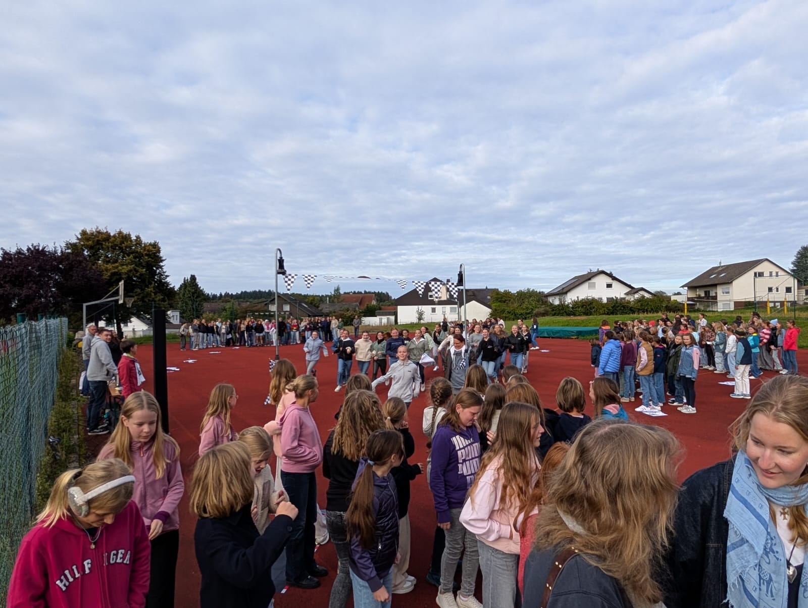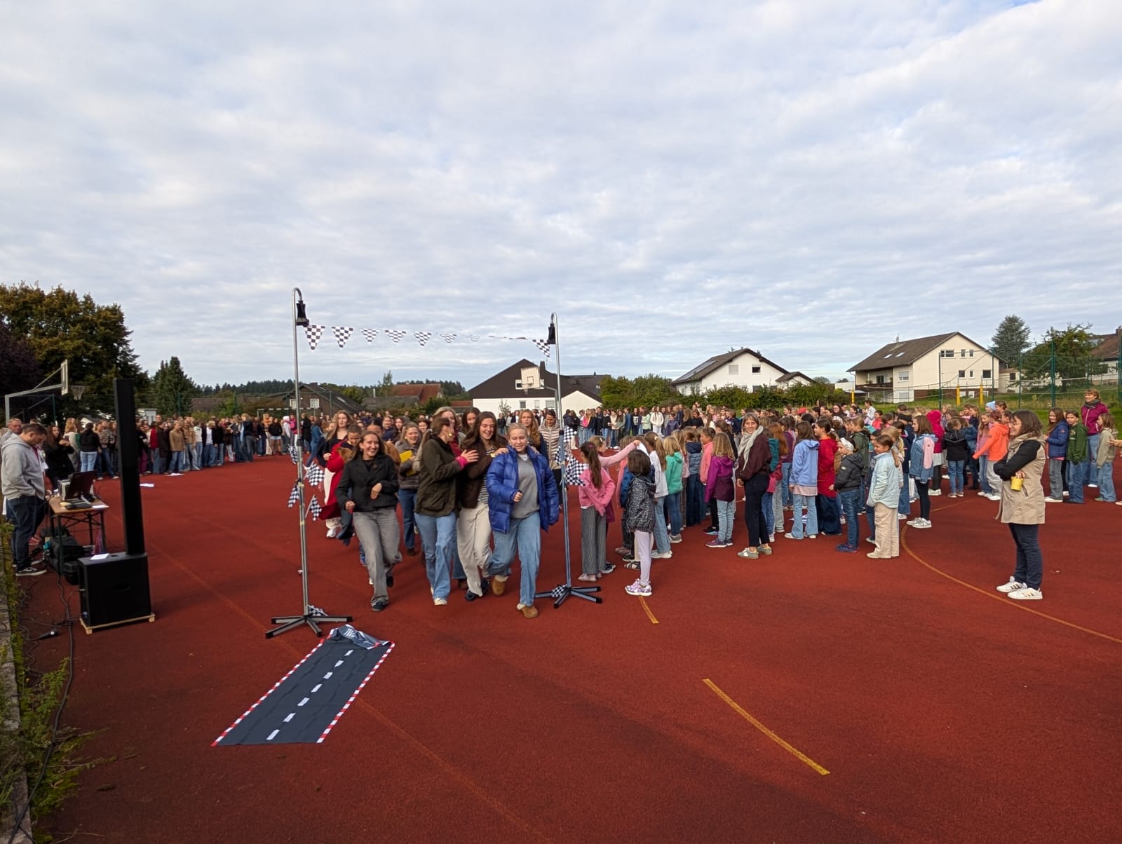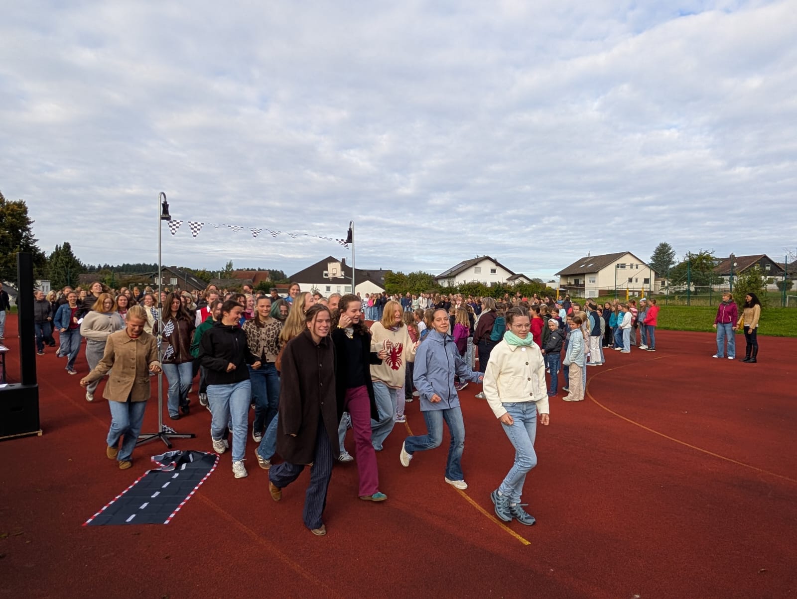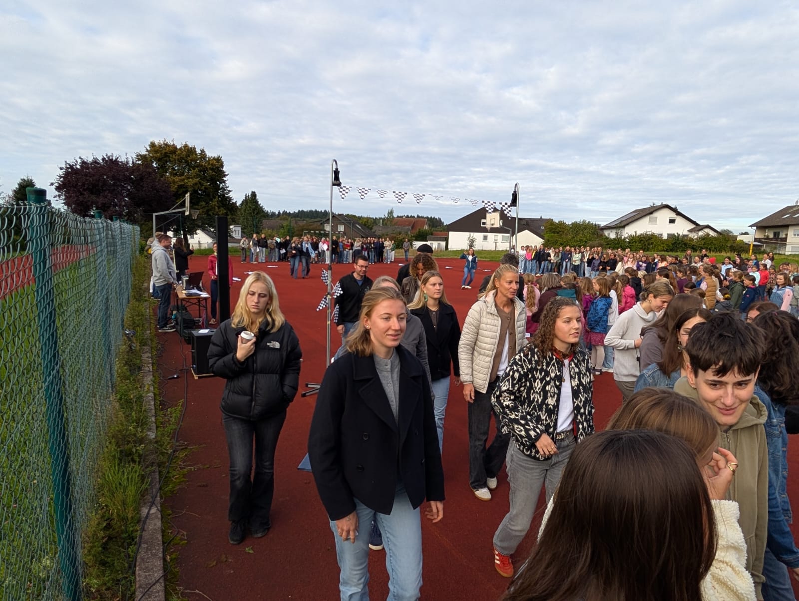 Zum Schulstart und in die erste Schulwoche gehört in Wald auch traditionell der Eröffnungsgottesdienst. Am Morgen des 17. September 2025 versammelte sich daher die Lehrer- und Schülerschaft, allerdings nicht in der Pfarrkirche St. Bernhard, sondern auf dem Tartanplatz hinter der Sporthalle. Andrea Wahl hatte dort unter Mithilfe der Technik-AG unter Leitung von Julian Pfau sowie den Hausmeistern eine große Soundanlage nebst schönem Startbogen aufgebaut und ordnete die Klassen bzw. Stufen mittels Papierbögen im Kreis an.