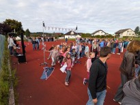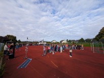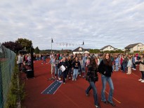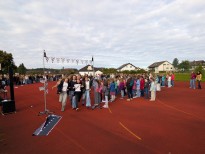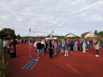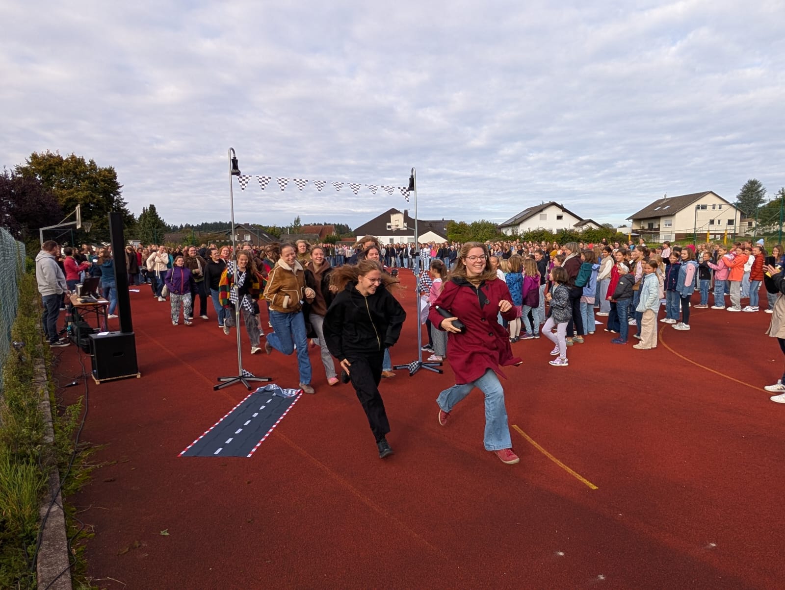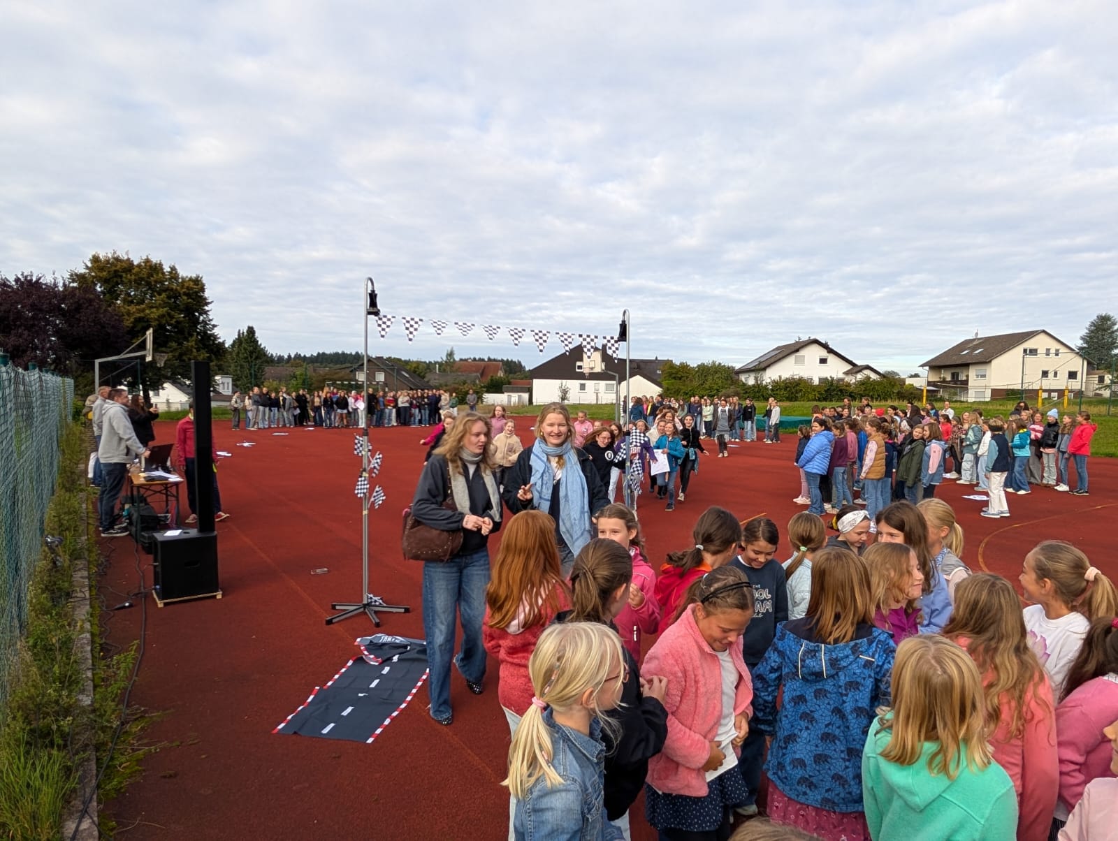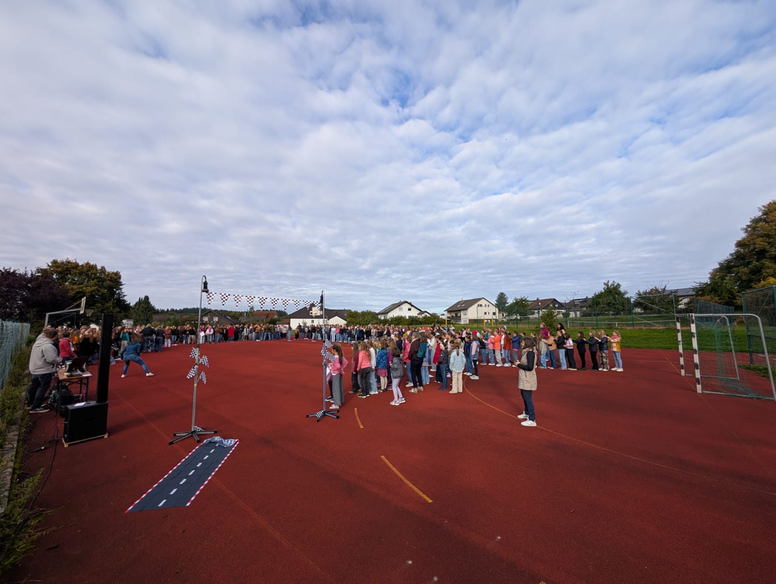 Zum Schulstart und in die erste Schulwoche gehört in Wald auch traditionell der Eröffnungsgottesdienst. Am Morgen des 17. September 2025 versammelte sich daher die Lehrer- und Schülerschaft, allerdings nicht in der Pfarrkirche St. Bernhard, sondern auf dem Tartanplatz hinter der Sporthalle. Andrea Wahl hatte dort unter Mithilfe der Technik-AG unter Leitung von Julian Pfau sowie den Hausmeistern eine große Soundanlage nebst schönem Startbogen aufgebaut und ordnete die Klassen bzw. Stufen mittels Papierbögen im Kreis an.